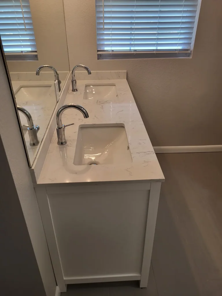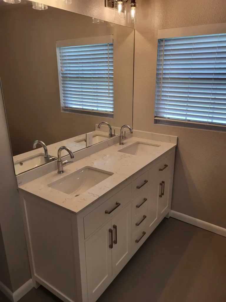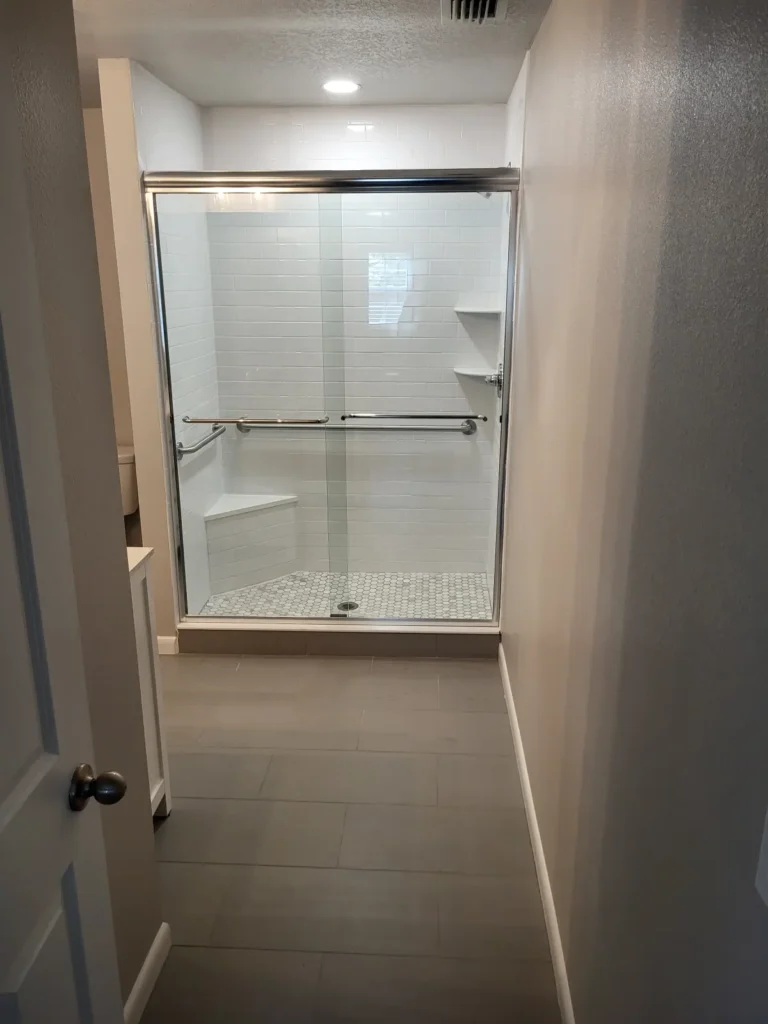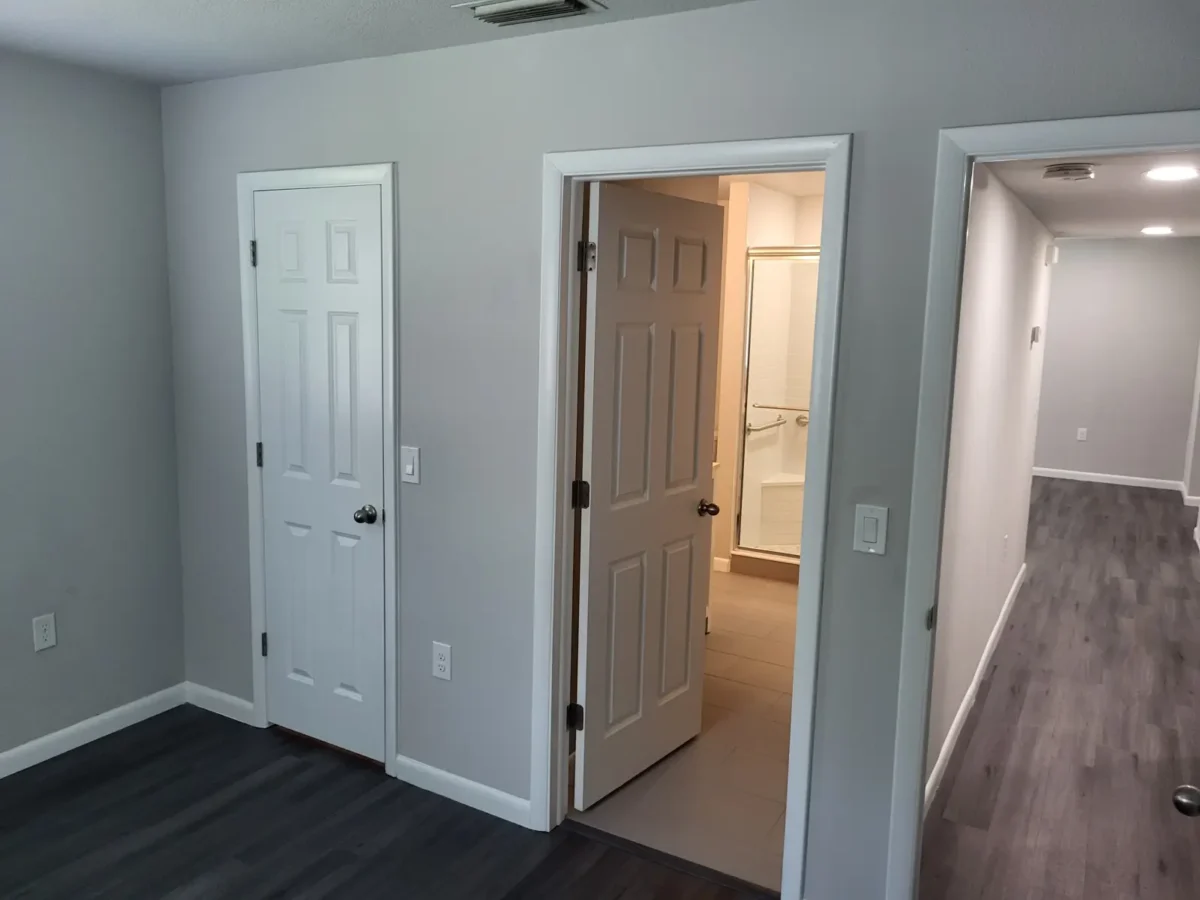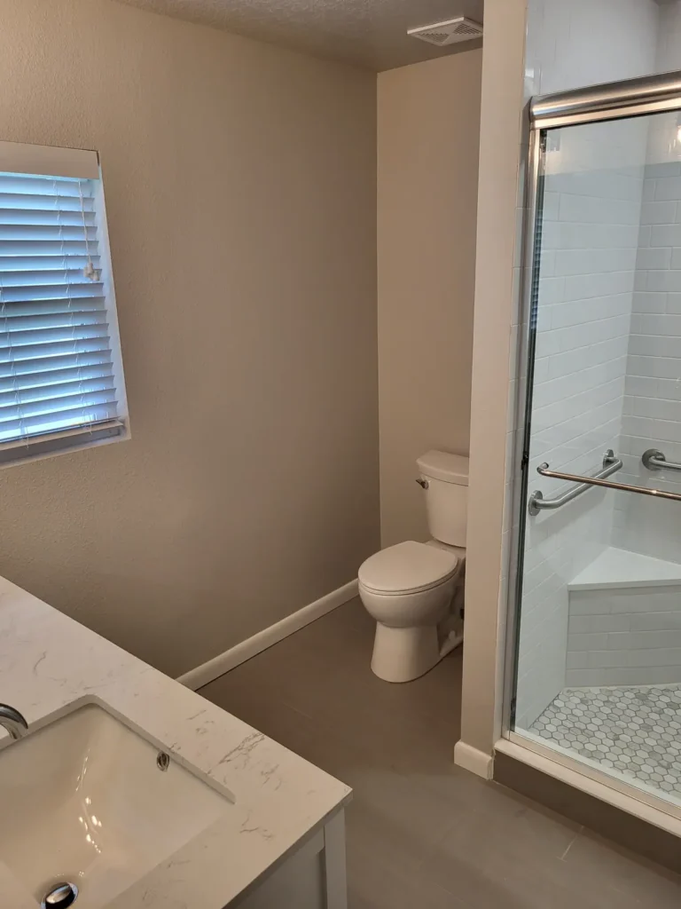 The new master bathroom was designed to balance style and function. A tiled walk-in shower created a clean, modern aesthetic, while a double vanity provided ample storage and daily convenience. New interior doors, exhaust fans with proper ducting, and carefully selected bathroom accessories contributed to a polished finish. Interior painting unified the new spaces with the surrounding rooms, ensuring a consistent appearance throughout the home.
